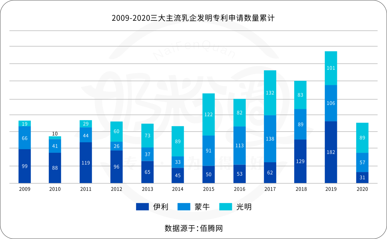 数据显示,伊利自2010年来,8年稳居国内主要乳企发明专利申请数量第一,它和另外两家乳企基本上贡献了国内主要乳企发明专利申报总量的94%以上。值得一提的是,伊利金领冠获得了“含α-乳清蛋白和β-酪蛋白组合的婴儿配方奶粉及其制备方法*”、“核苷酸组合物及其在食品中的应用**”等五项国家发明专利,其中“核苷酸组合物及其在食品中的应用”专利更是获得了14项中外专利授权认证。
