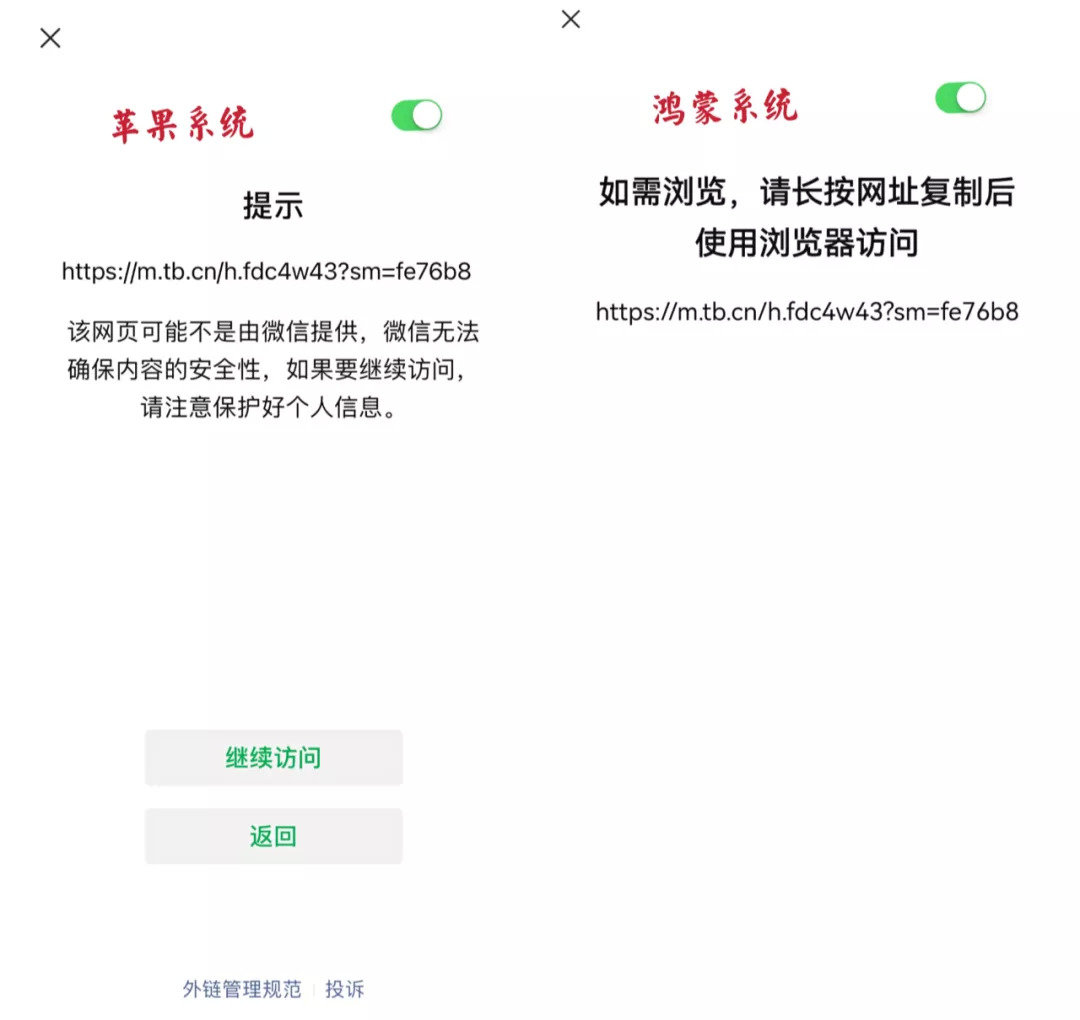 图 / 17日更新微信版本后打开淘宝链接的提示页面(左:苹果手机;右:华为手机);来源 / 蔡司