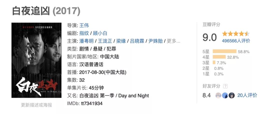 2017年8月,优酷推出自制犯罪悬疑剧《白夜追凶》,播出之后好评不断,截至9月19日,其豆瓣评分维持9.0的高分,有超过49万人的标记,评分四星以上占比91.6%。