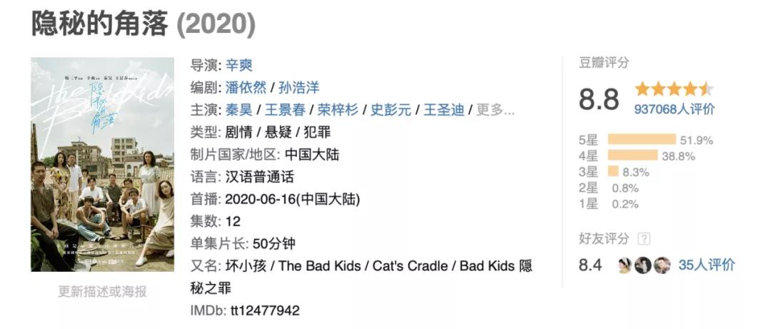 2020年6月,爱奇艺推出自制剧《隐秘的角落》,开播两周微博全站热点曝光总量超过二十亿,视频播放量超过十九亿,在豆瓣则有超过93万观众标记,四星以上占比90.7%,并先后入围「2020年最佳国际剧集榜单」、「2021年首尔国际电视节迷你剧单元」等。