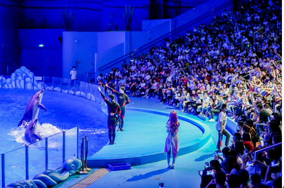 闯入海世界,蔚蓝的海水中,上千种海洋生物自由自在游弋;在海底沉船隧道,美人鱼表演唯美曼妙;在海豚剧场,轻盈跳跃的海豚让人沉浸在奇幻浪漫中。