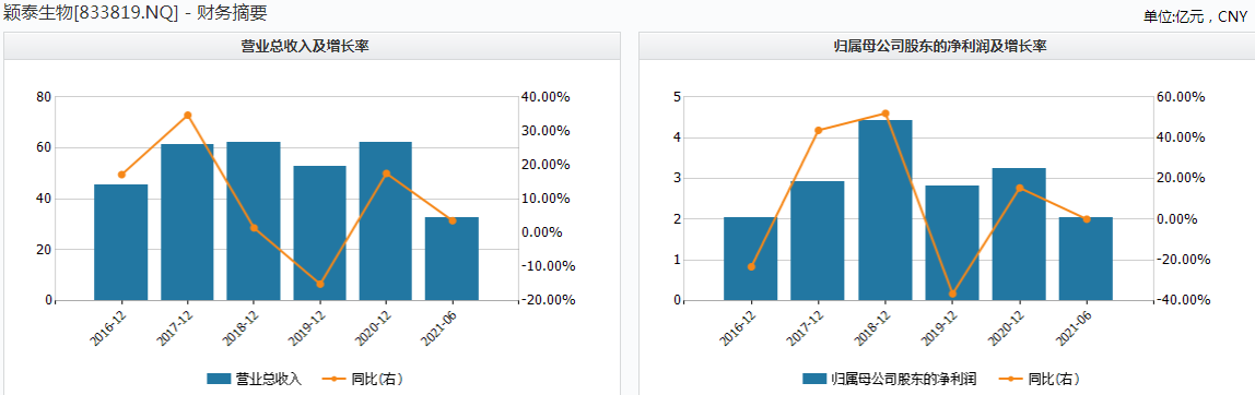 财务数据显示,2016年至2020年,颖泰生物分别实现营业收入45.58亿元、61.4亿元、62.32亿元、52.95亿元、62.25亿元,实现归属于上市公司股东的净利润分别是2.03亿元、2.92亿元、4.43亿元、2.82亿元、3.25亿元。2021年上半年,该公司实现营业收入同比增3.64%至32.54亿元,归母净利润同比微增0.13%至2.04亿元。