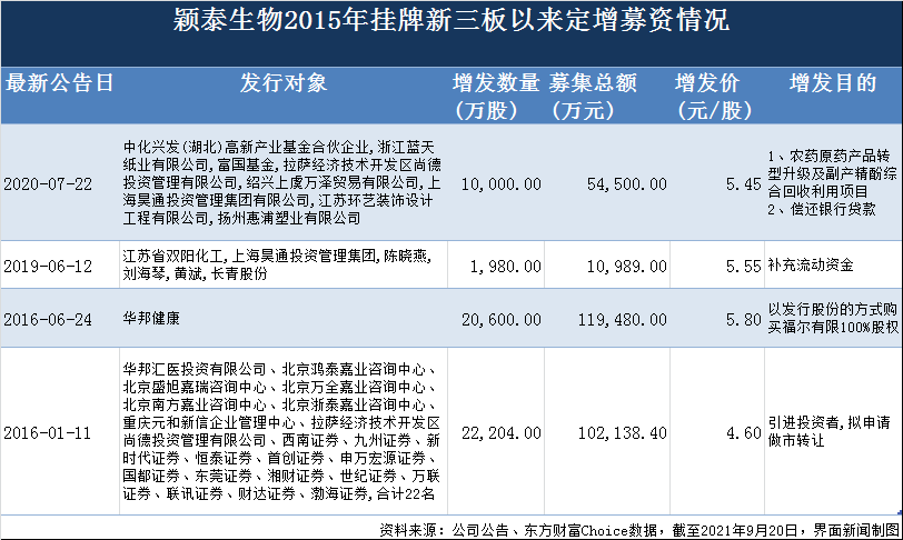 自2015年挂牌新三板以来,该公司一共实施完成了四次定增募资动作,分别于2015年向关联公司华邦汇医投资有限公司、西南证券等包含做市商在内的22名投资者发行2.22亿股,合计募资10.21亿元;于2016年6月向控股股东华邦健康发行2.06亿股,募资11.948亿元。2019年6月,该公司向长青股份(002391.SZ)、江苏省双阳化工、上海昊通投资、陈晓燕等增发1980万股,募资10989万元。2020年7月转到精选层挂交易时,颖泰生物获中化兴发、浙江蓝天纸业、富国基金、拉萨尚德投资等认购1亿股,合计募资5.45亿元。统计下来,颖泰生物自2015年10月挂牌新三板以来合计募资28.71亿元。