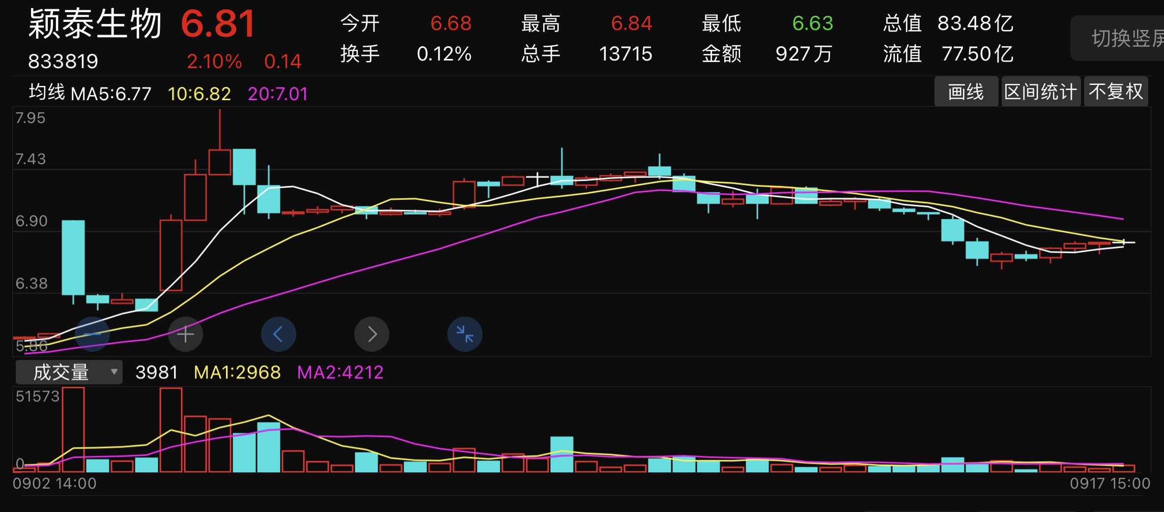 自9月2日晚北京证券交易所(简称“北交所”)高规格官宣以来,新三板精选层挂牌公司颖泰生物(833819.NQ)股价累计涨幅近13%。9月17日,该公司股价报收6.81元/股,涨2.1%,市值83.48亿元。