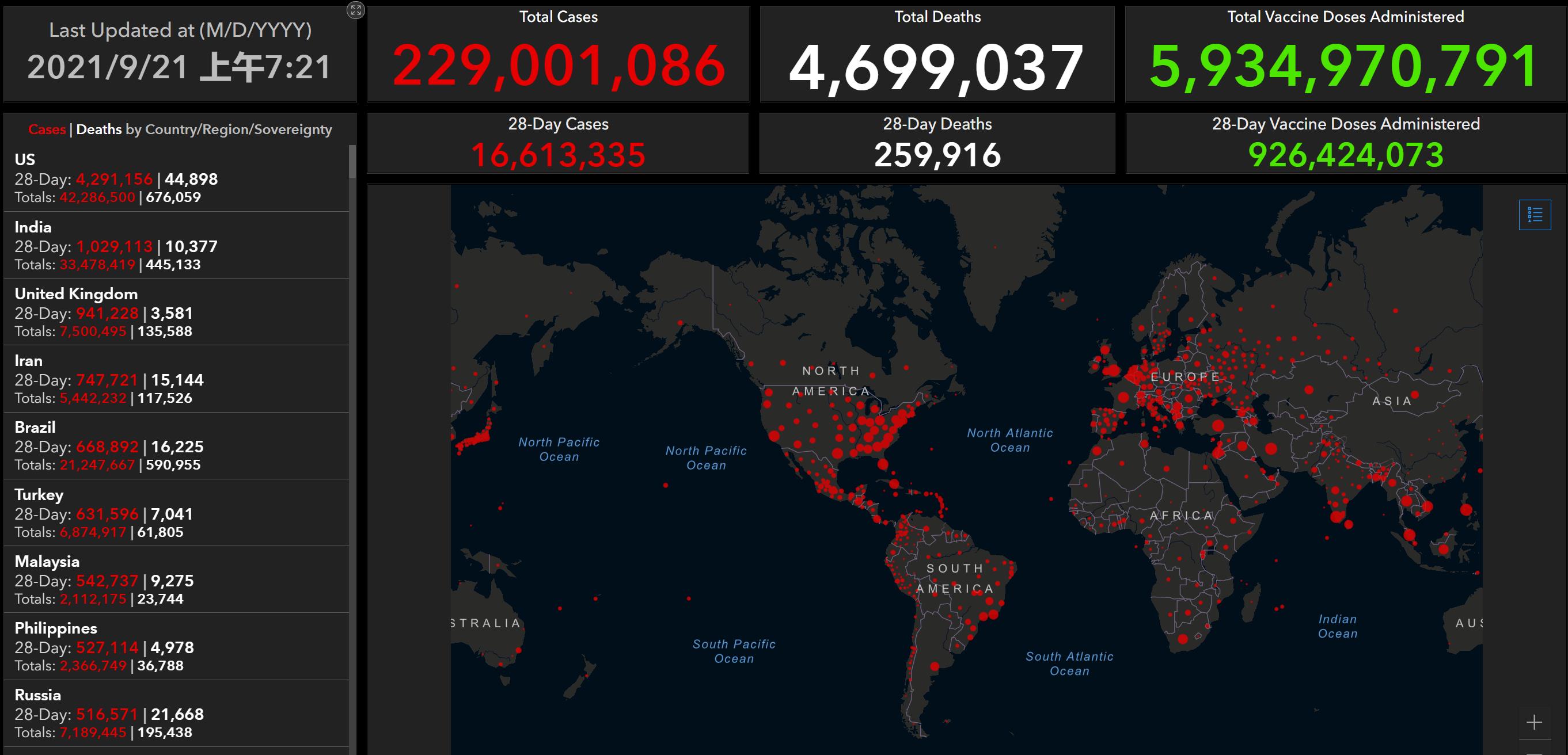 据约翰·霍普金斯大学的疫情追踪数据,截至北京时间9月21日上午8点30分,全球累计确诊新冠肺炎病例229001086例,累计死亡4699037例,接种疫苗超59.34亿剂次。