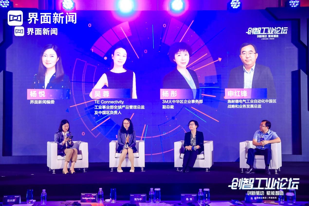 9月16日,由上海报业集团 | 界面新闻主办的2021【创智工业论坛】(第23届中国工博会官方重点论坛之一)在上海虹桥康得思酒店顺利举办。在高峰对话“‘碳中和’政策下的工业企业如何赋能产业升级”中,界面新闻编委杨悦担任主持,TE Connectivity工业事业部全球产品管理总监及中国区负责人吴蓉女士、3M大中华区企业事务部副总裁杨彤女士、施耐德电气工业自动化中国区战略和业务发展总监申红锋先生担任圆桌对话嘉宾。嘉宾立足政策导向,围绕“碳中和”与中国制造业的数字化转型等话题进行讨论。
