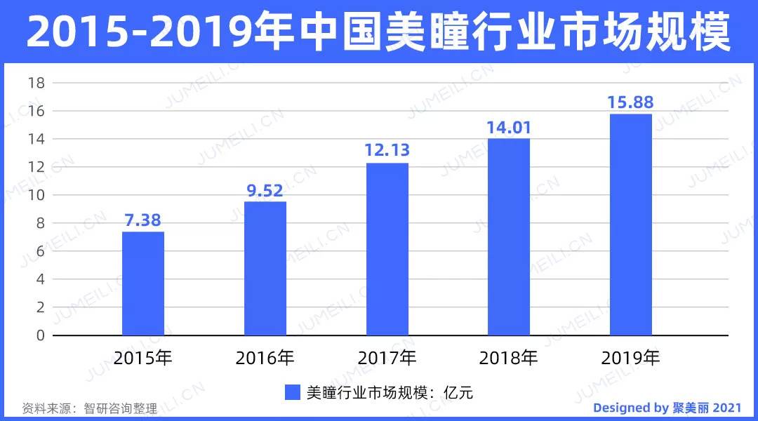 根据《2021-2027年中国美瞳行业发展现状调查及前景战略分析报告》,2015年中国美瞳行业市场规模为7.38亿元,2019年中国美瞳行业市场规模为15.88亿元,年复合增长率为21.12%。Mob研究院预测,2025年,中国美瞳行业市场规模可达500亿元,有望成为全球最重要的市场。