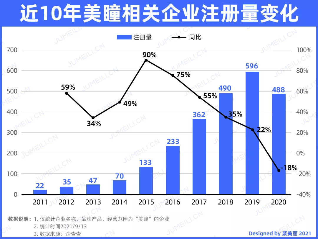 从美瞳相关企业的注册量增长趋势来看,近3年注册量均超过400家,其中2018年新增490家,同比增长35%;2019年新增596家,同比增长22%;2020年略有下降,新增488家,同比下降18%;今年前8个月共新增236家。