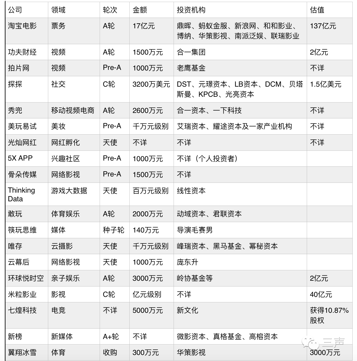 过去一周,最受关注的文娱投融资事件,应当属于淘宝电影获得17亿元A轮融资。137亿元估值、更名“淘票票”,明显对标获得腾讯投资的微影时代旗下的微票儿。敏感的人已经可以闻到票务领域的硝烟味道:战争即将开始。 除了淘宝电影,阿里旗下的优酷土豆过去一周动作也不少,这家老牌视频网站正在加快推进对内容的掌控力度,1500万元A轮投资功夫财经、2600万元投资移动视频电商秀兜,对已经委身阿里的优酷土豆而言,内容和电商的结合,将越来越紧密。 比起阿里系在内容侧的频频发力,一向资金链紧张的乐视,本周花费30亿元进军房地产,就有些让人看不懂了。不过山西人“贾布斯”从来不做赔本买卖,乐视与房地产将产生怎样的“生态化反”,我们可以拭目以待。