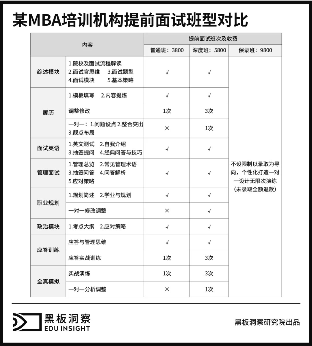 MBA 培训机构也相应推出面试相关科目。由于阶段性需求明显,许多机构会将提前面试、联考、复试培训分开收费,合计费用上万。全科目封闭式集训费用则更高,普遍在 3-4 万。线下机构受限于地域因素,往往会专攻当地一所或多所高校进行培训,有的直接将高校校名融入机构名称中。线上培训则多以录播课为主,价格低于线下。也有相当一部分考生选择买辅导书自学,等到冲刺阶段再买课,进行系统性复习。