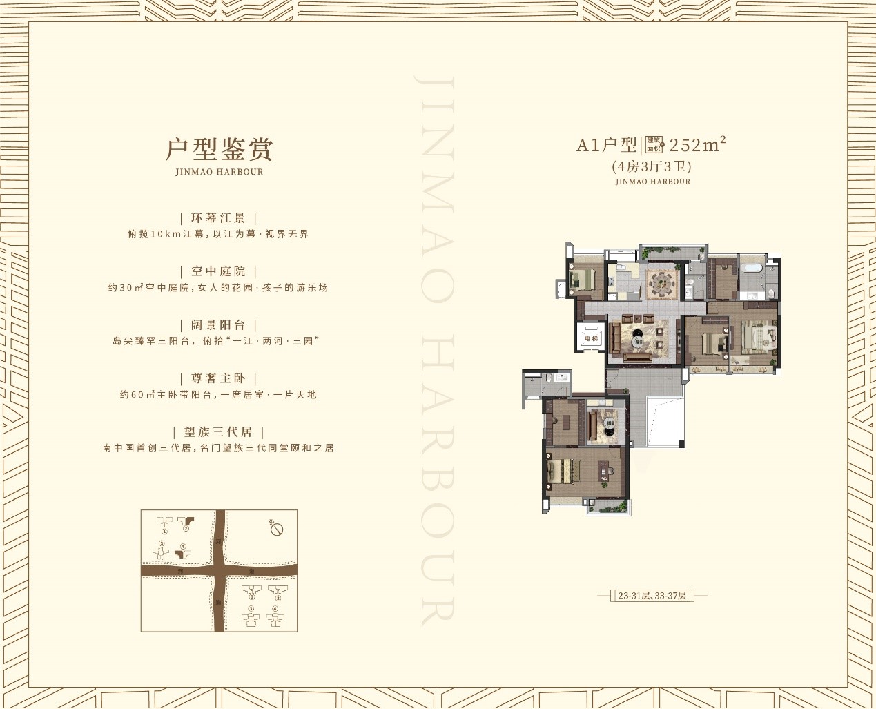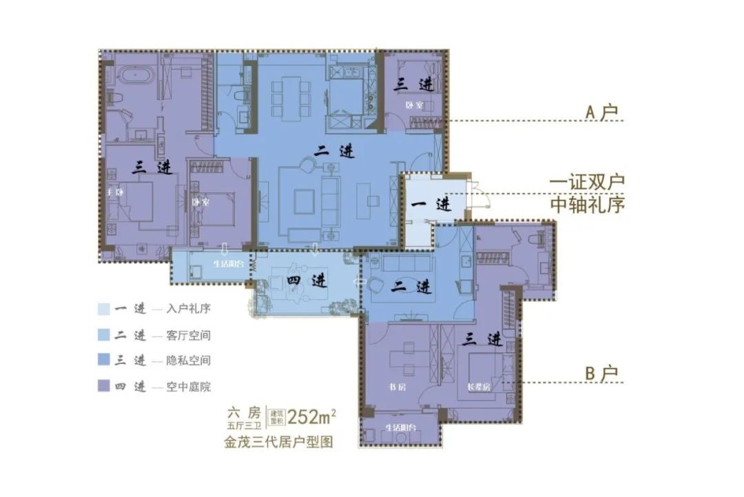 灵山岛金茂湾区252㎡的户型为创新型庭院的六居室,其首创了合院式四进三代居户型,最初设想是为了满足三代同堂的家庭共享空间的需求,充分考虑了居住体验性及便利性。据了解,这一户型在整个岛上总占比不超过5%。
