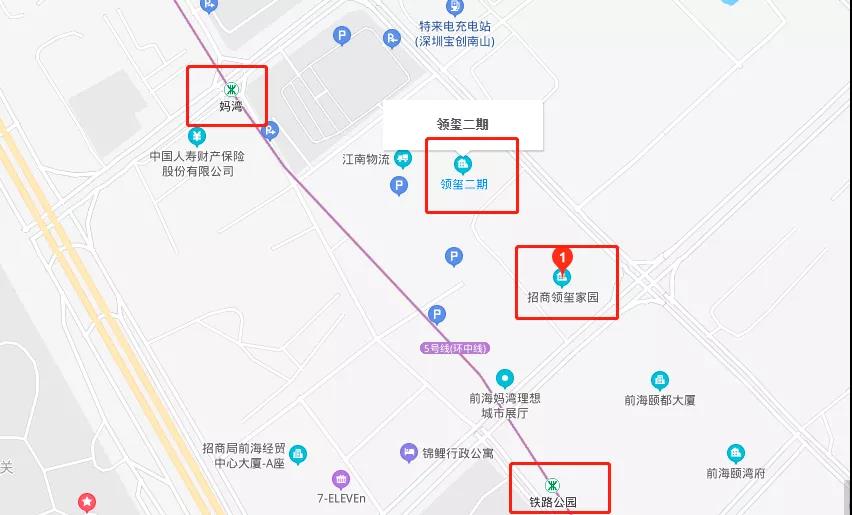 招商领玺一期位于前海妈湾怡海大道与港城路的交汇处,在5号线铁路公园站B出口处,两地直线距离不到300米。