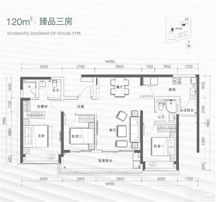 120平方米的户型被打造成三房两厅两卫,竖厅设计,其中还带有一个超大的观景阳台和一个小型的生活阳台。