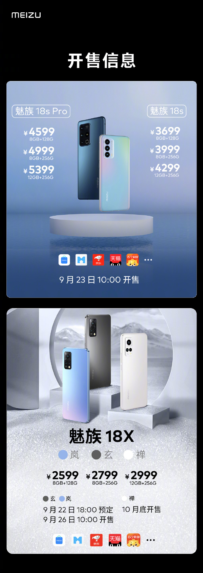 @魅族科技 微博消息,9月22下午,魅族科技举行秋季新品发布会,推出三款新机:魅族18s、18s Pro和18X。起售价分别为3699元、4599元、2599元。其中,18s/18s Pro将于23日10点开售,18X将于22日18点开启预订。