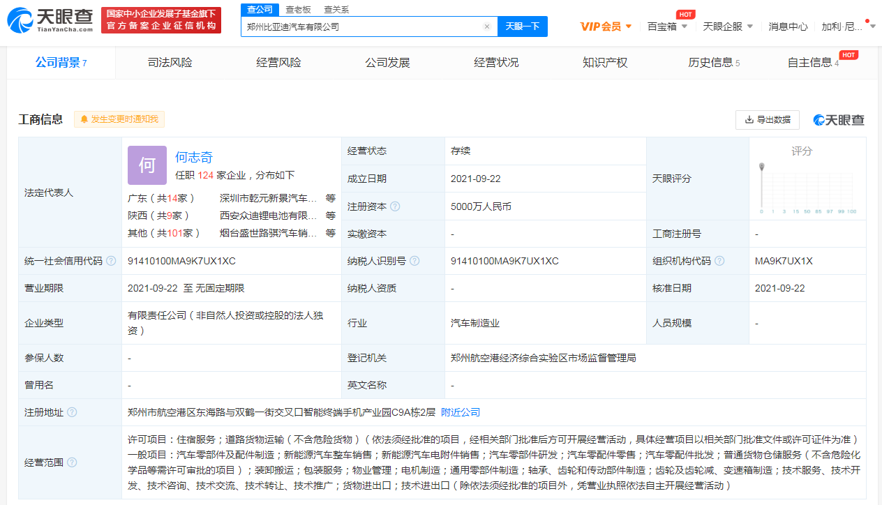 据天眼查APP显示,9月22日,郑州比亚迪汽车有限公司成立,法定代表人为何志奇,注册资本5000万人民币,经营范围包括汽车零部件及配件制造;新能源汽车整车销售;电机制造;通用零部件制造等。股东信息显示,该公司由比亚迪汽车工业有限公司全资控股。