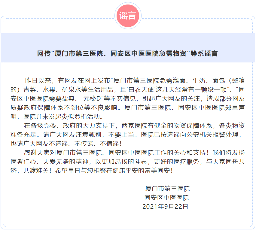 据“厦三院宣传中心”9月22日消息,昨日以来,有网友在网上发布“厦门市第三医院急需泡面、牛奶、面包〈整箱的)青菜、水果、矿泉水等生活用品,且‘白衣天使’这几天经常有一顿没一顿”、“同安区中医医院需要盐典、 元秘D”等不实信息,引起广大网友的关注,造成部分网友质疑政府保障体系不到位等不良影响。厦门市第三医院、同安区中医医院郑重声明,医院并未发起类似募捐活动。