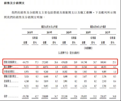 首先是销售及分销开支,截至2021年上半年末,占收入的比重在34%。这里面,最主要的部分其实是用在了营销及推广开支上。2021年上半年,营销及推广开支,占收入的比重达到25.1%,金额为4.15亿元,占到销售及分销开支的73.87%。