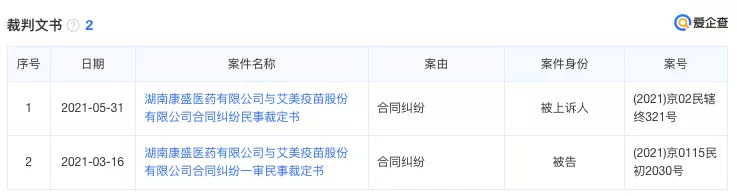 从爱企查工商软件信息可知,目前艾美疫苗与市场推广商——湖南康盛医药有限公司已经出现纠纷,正在打官司。