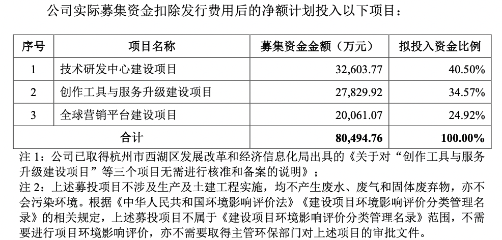 公司于2012年12月正式上线小影(VivaVideo),作为行业早期玩家,小影科技至今为全球200多个国家和地区用户提供优质、高效的视频创作服务,其IPO募投项目如下: