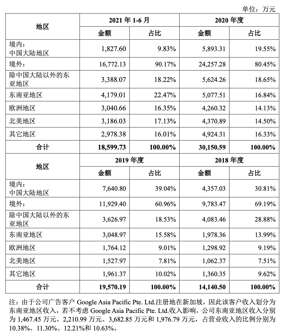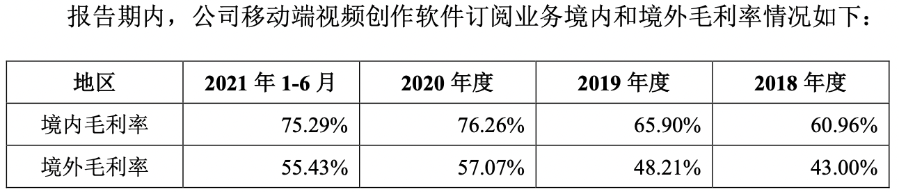 界面新闻记者注意到,抖音、快手的“参战”也的确对公司经营业绩造成影响,招股书显示,2020年和2021年1-6月公司境内营业收入下滑,其主要原因便是国内部分短视频平台(例如抖音、快手)参与移动端视频创作软件行业的市场竞争中,其剪辑产品主要服务于自身短视频平台生态,目前未采用订阅模式,用户可以免费使用产品的各项功能。在此背景下,公司在国内市场选择了稳健的应对策略,在产品运营和广告投放上未做重点投入,导致中国大陆地区收入降低。