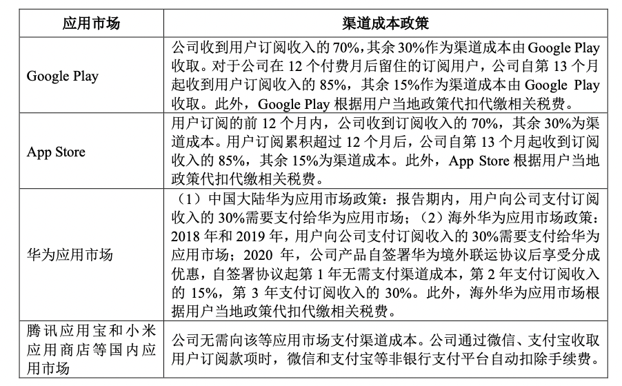 根据上述应用市场相关政策,公司收取的订阅收入中会扣除部分渠道成本,界面新闻记者查阅招股书发现,应用市场的渠道成本政策各不相同,具体如下:
