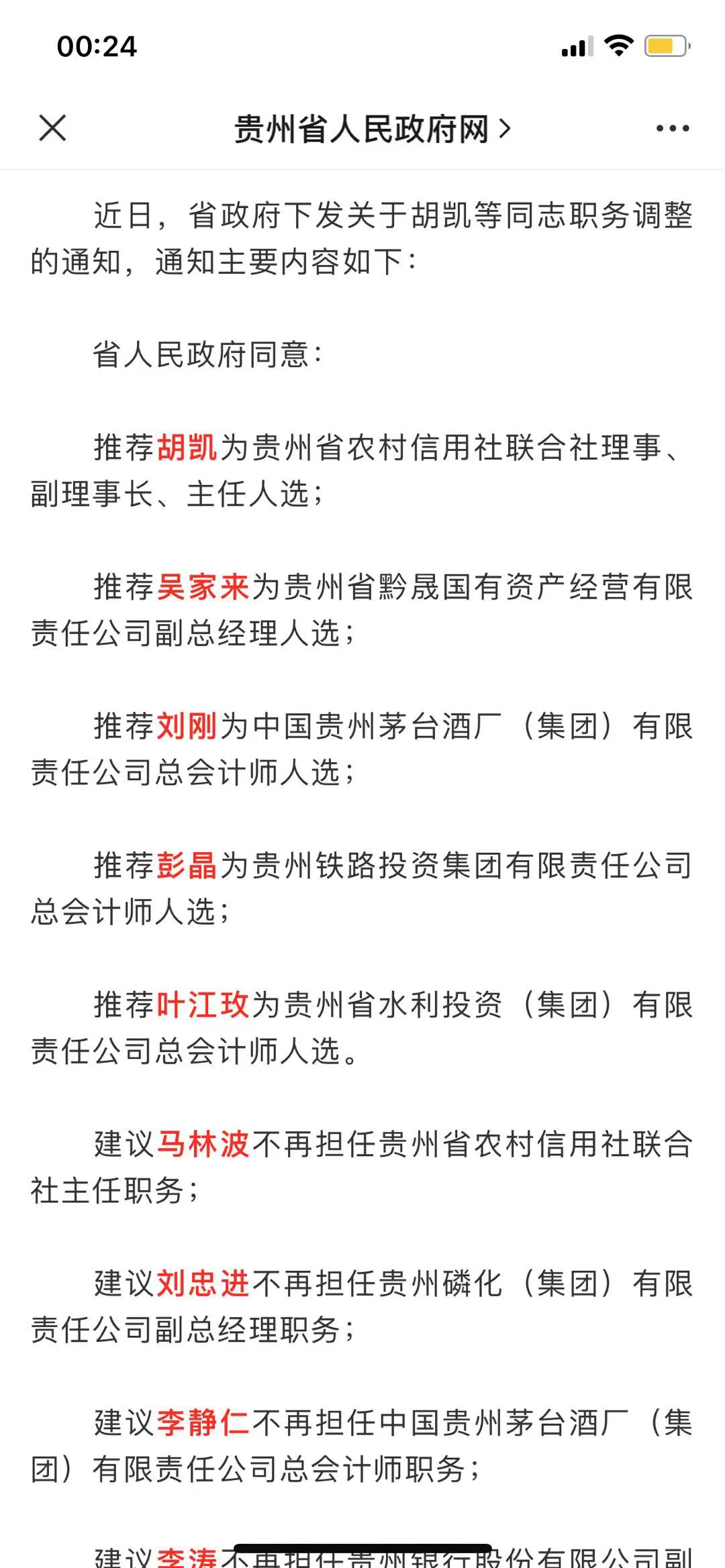 9月23日,界面记者从贵州省人民政府网官微获悉,贵州省人民政府发布相关职务调整通知。根据通知显示,省政府推荐刘刚为中国贵州茅台酒厂(集团)有限责任公司(以下简称“茅台集团”)总会计师人选,并建议李静仁不再担任茅台集团总会计师职务。