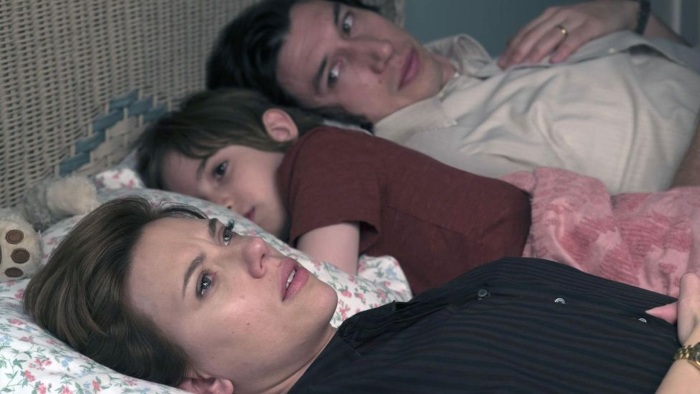 在《婚姻故事》中,约翰逊和亚当·德赖弗扮演妮可和查理,一个是演员,一个是导演,两人一起在男方的剧团工作。布鲁克林家中的墙上挂着一篇关于他们的杂志文章,标题就是《婚姻场景》,这句话绝不是一个好兆头。