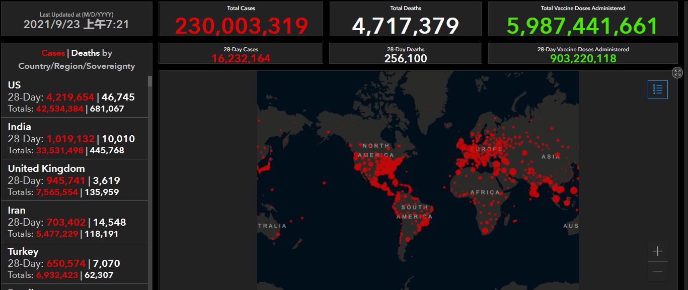 据约翰·霍普金斯大学的疫情追踪数据,截至北京时间9月23日上午8点,全球累计确诊新冠肺炎病例230003319例,累计死亡4717379例,接种疫苗超59.8亿剂次。