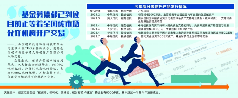 7月11日,中融信托发行首单碳交易CCER投资信托,上海宝碳担任投资顾问,信托资金将投资于碳排放权交易所上市的CCER,并适时参与碳市场交易;今年2月,中航信托与中国节能协会碳交易产业联盟、上海宝碳联合设立“碳中和”主题绿色信托计划,投资标的覆盖全国范围内可交易的优质碳资产,今年7月已完成部分碳资产数百万级规模的首批建仓。