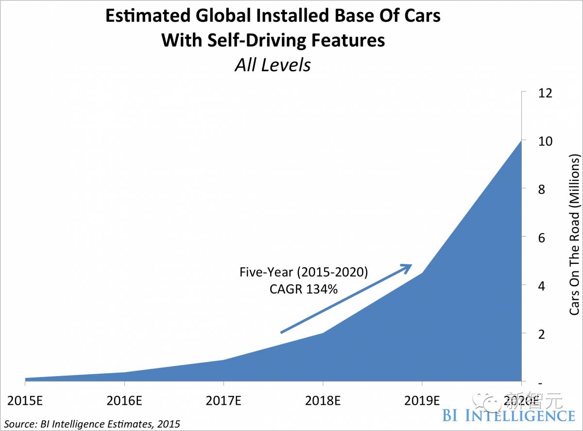 根据科技调研公司BI Intellgence的预测,从2015年到2020年,配置全自动驾驶的汽车数量可能会攀升到1千万辆。