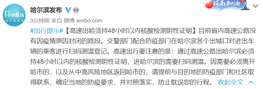 据@哈尔滨发布 微博消息,目前省内高速公路没有因疫情原因封闭的路段。交警部门配合防疫部门在哈尔滨各个出城口对进出车辆的乘客进行扫码测温登记。高速出行要注意的是:通过高速公路出哈尔滨必须持48小时以内的核酸检测阴性证明,进哈尔滨的需要扫码测温。因需要必须离开哈市的,以及从中高风险地区返回哈市的,请提前与目的地的防疫部门和社区取得联系,确定当地的防疫要求,并对照落实,防止耽误您的行程。