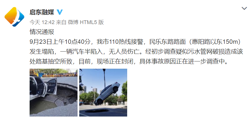 据@启东融媒 微博消息,9月23日上午10点40分,启东市110热线接警,民乐东路路面(惠阳路以东150m)发生塌陷,一辆汽车半陷入,无人员伤亡。经初步调查疑似污水管网破损造成该处路基抽空所致,目前,现场正在封闭,具体事故原因正在进一步调查中。