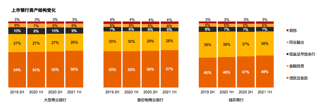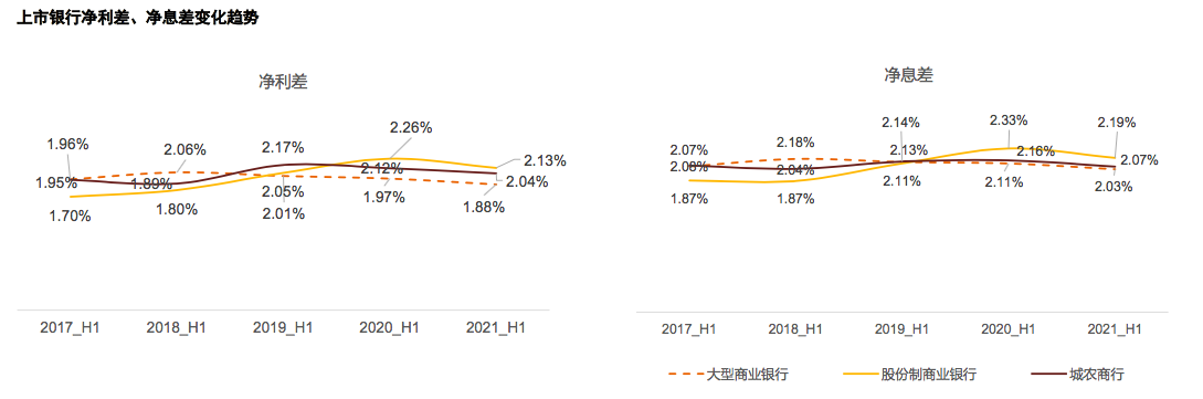 与此同时,2021 年上半年,大型商业银行和股份制商业银行平均总资产收益率(ROA)均略有上升,城农商行则基本持平。大型商业银行、股份制商业银行和城农商行净利差、净息差普遍呈收窄趋势。