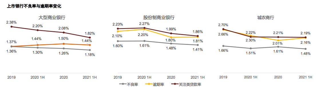 报告显示,2021年6月末,上市银行整体不良率从2020年末1.51%降至1.44%,逾期率从1.49%降至1.45%。其中,不良率在2%以上的有6家,均为城市商业银行,主营地区较为集中在东北、环渤海和中西部,另有8家城农商行不良率低于1%,主营区域集中在长三角。