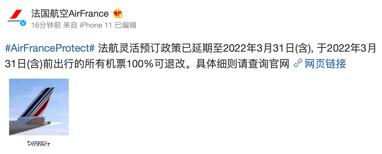 据@法国航空AirFrance 微博消息,法航灵活预订政策已延期至2022年3月31日(含),于2022年3月31日(含)前出行的所有机票100%可退改。