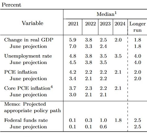 9月的美联储会议上,美联储官员就普遍下调了对短期内经济形势的预期,体现了疫情给美国经济带来的影响。本次会议上美联储官员预期今年的实际GDP增速为5.9%,而6月时的预测为7.0%。随后两年的经济增速预测则略有上调。失业方面,美联储官员目前预测今年年底的失业率为4.8%,而6月时的预测为4.5%。随后两年的失业率预测与6月相比无变化。