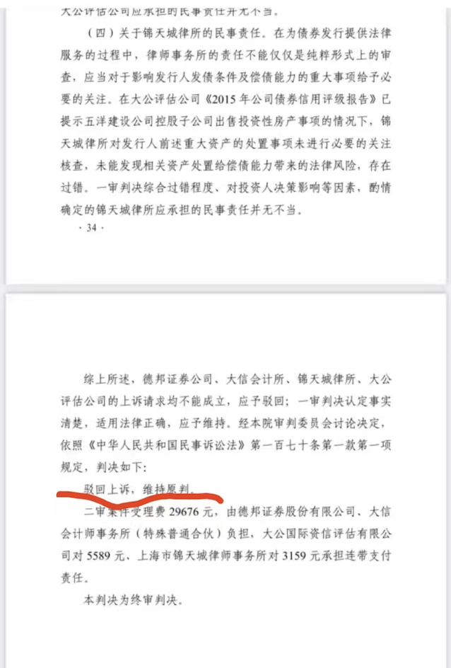 界面新闻独家获悉,浙江高院已于近日作出五洋债案终审结果,二审维持原判,即五洋建设董事长陈志樟、德邦证券、大信会计师事务所承担487名自然人投资者合计7.4亿元债务本息的连带赔偿责任,锦天城律所和大公国际资信评级有限责任公司分别在5%和10%范围内承担上述债务的连带赔偿责任。