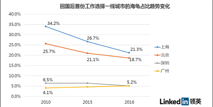 相比之下一线城市吸引力降低,五年前北上广深回国就业人员占比达到70%,2015年就降到了59%,到目前为止下降到50%。其中上海下降最多,北京其次,但广州、深圳基本持平,深圳在2015年甚至有所上升。
