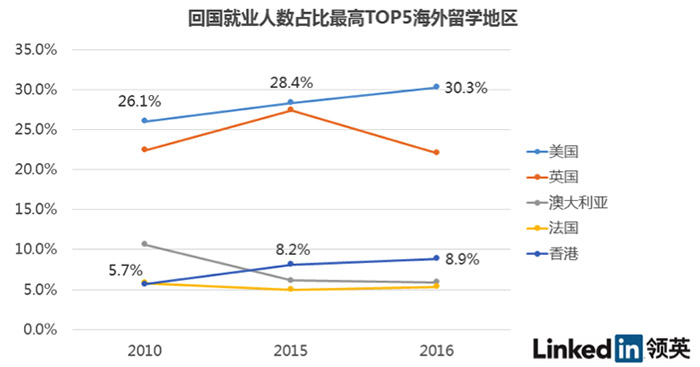 根据领英数据显示,近5年来我国海外留学人员回大陆就业的人数正在逐年增加,其中从美国、英国毕业的留学生在回国就业的留学生群体中占比最高,从2010年的49%上升到了2015年的56%。此外,在香港留学后返回大陆就业的人员在所有归国人员中占比上升得最快,从2010年的6%上升到现在的9%。2016年上半年的数据显示,香港留学生是继美、英留学生后回大陆发展人数最多的,在全球排第三名。