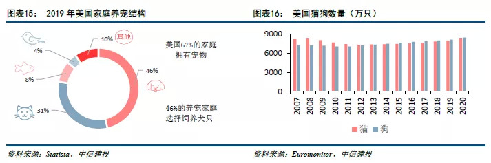 根据美国人口普查局数据,超过70%的美国居民住在别墅中,宽敞的活动面积、看家护院的特殊需求,使犬类的渗透率相对更高。相比之下,人均居住面积较小的日本(2018年人均居住面积23.28平方米),养猫家庭就更多。