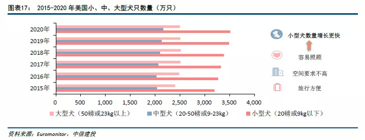 需要关注的是,养犬家庭中,小型犬的数量和增速都高于中型犬和大型犬。