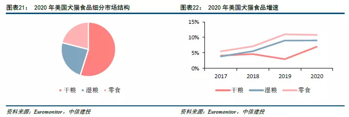 在美国,零食的增速最高,5年CAGR 达6.8%,其次为湿粮和干粮,5年GAGR分别为5.4%和3.7%。