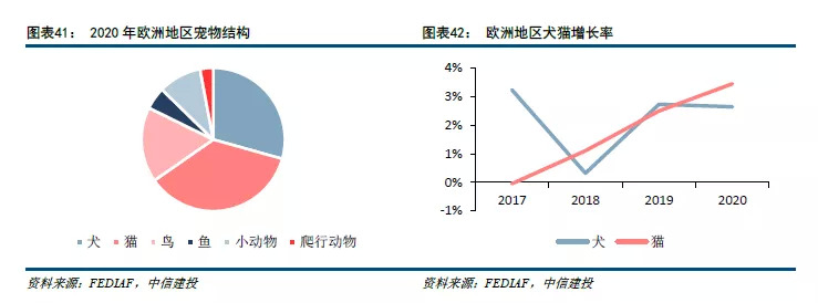 欧洲方面,宠物猫的数量高于宠物犬,近年来宠物猫的增速也超过宠物犬,2020年更是达到3.5%的新高。
