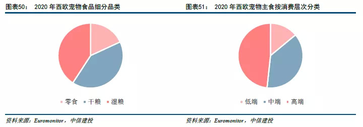 在欧洲,西欧宠物食品市场中,以销售额统计,干粮与湿粮市场份额均为41%,零食市场份额约为18%。从价格分布来看,高端主粮市场份额最大,约占48%,中端主粮占比约38%,低端主食占比约14%。