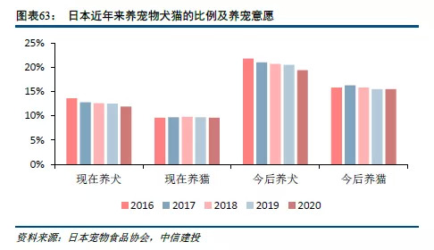 日本方面,2017年宠物猫的数量超过宠物犬,公众养犬的意愿也持续降低,养猫意愿则比较平稳。