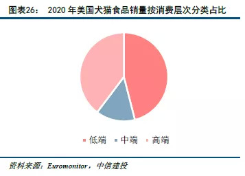 从价格分布来看,高端和低端主粮的占比接近,,2020年分别是46%和40%,中端猫狗粮占比最低,只有14%。