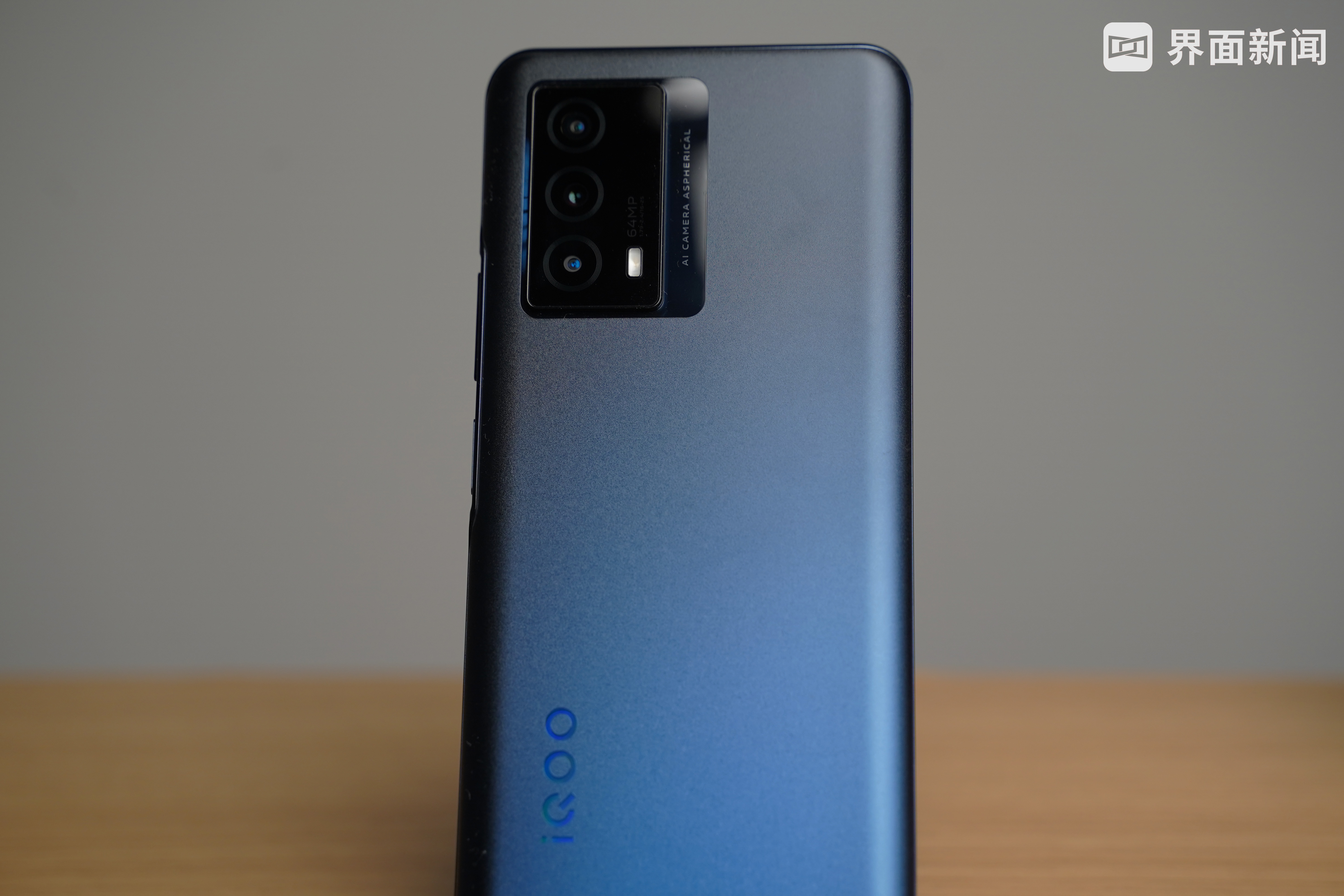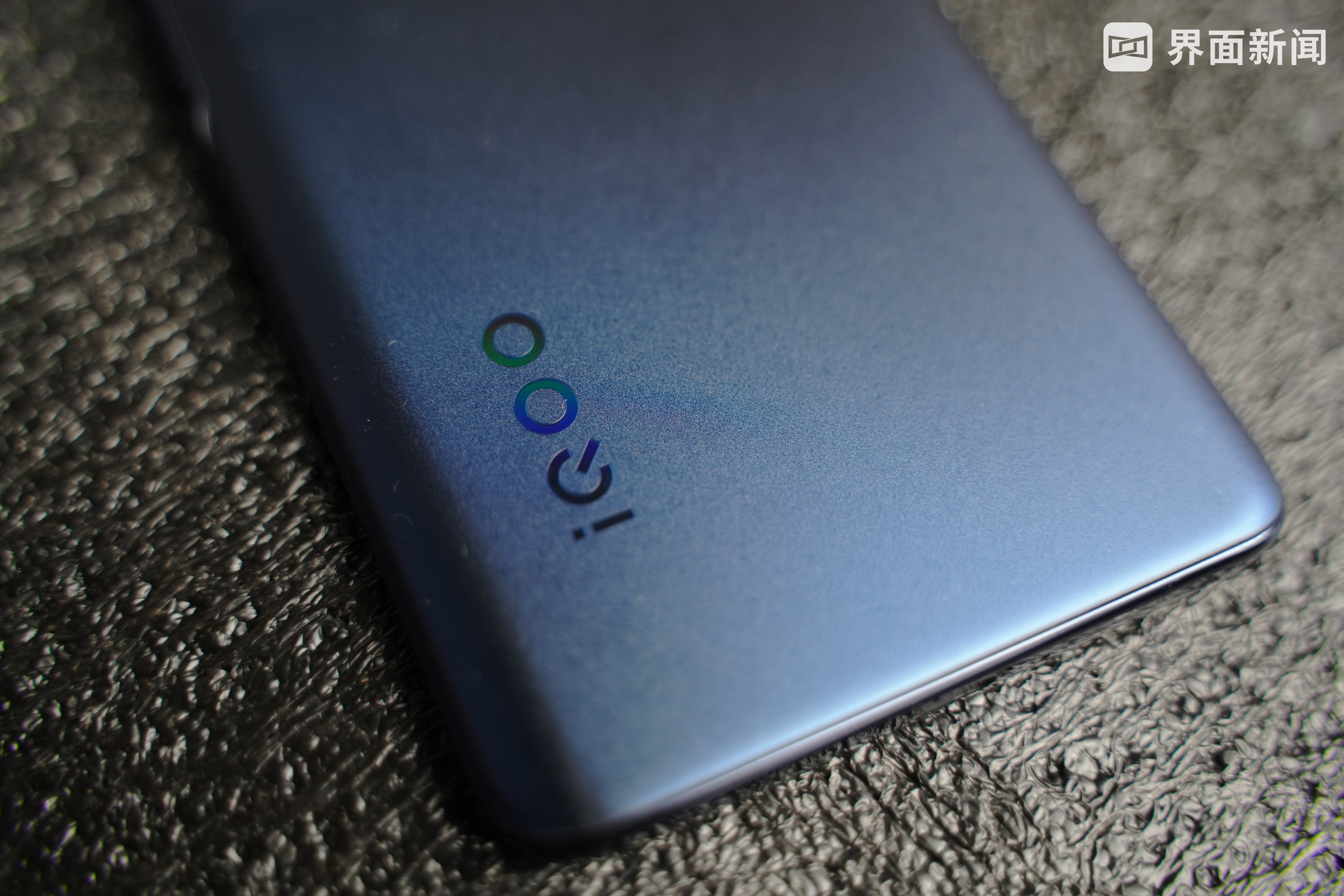 我拿到的是“蓝色起源”配色,总体为深蓝的观感,但在强光照射下会泛出微微的暖色。后盖的工艺则为喷砂处理,触感比较细腻亲肤,侧面的腰线设计则比较贴合手掌,整体握感上还是iQOO一贯的瘦长体验。