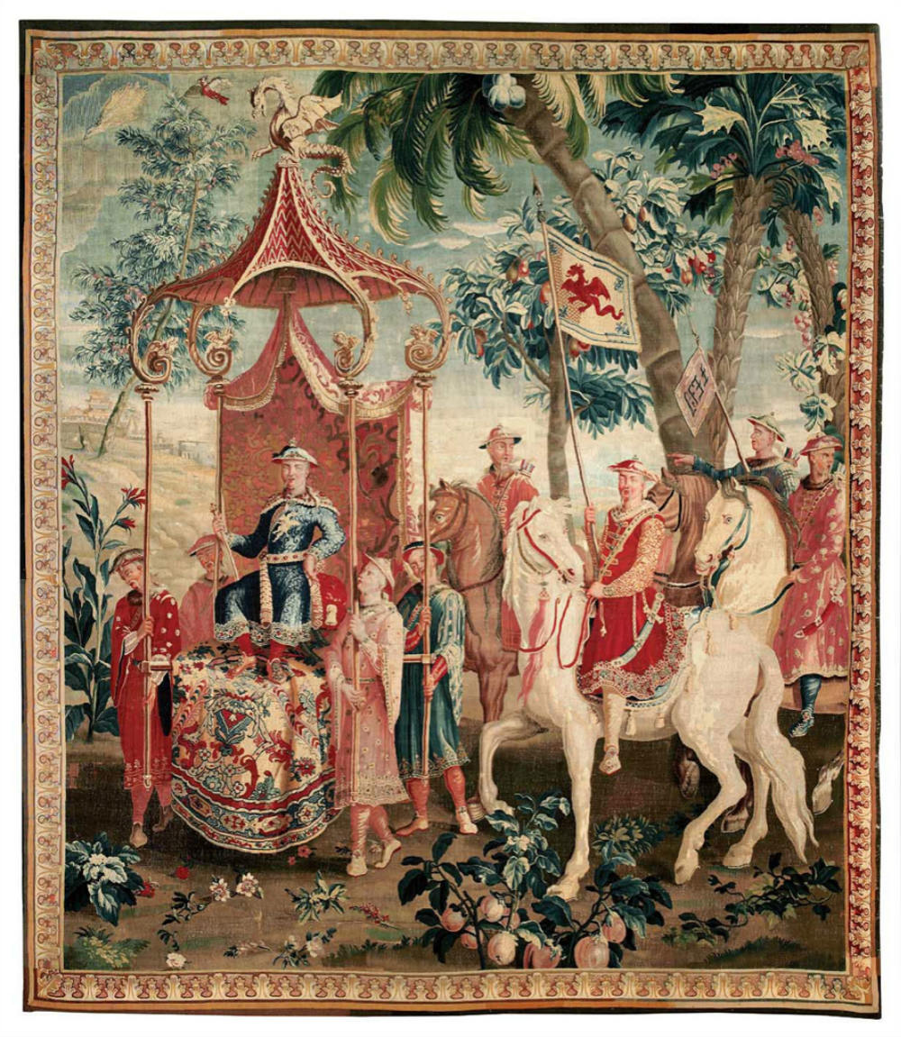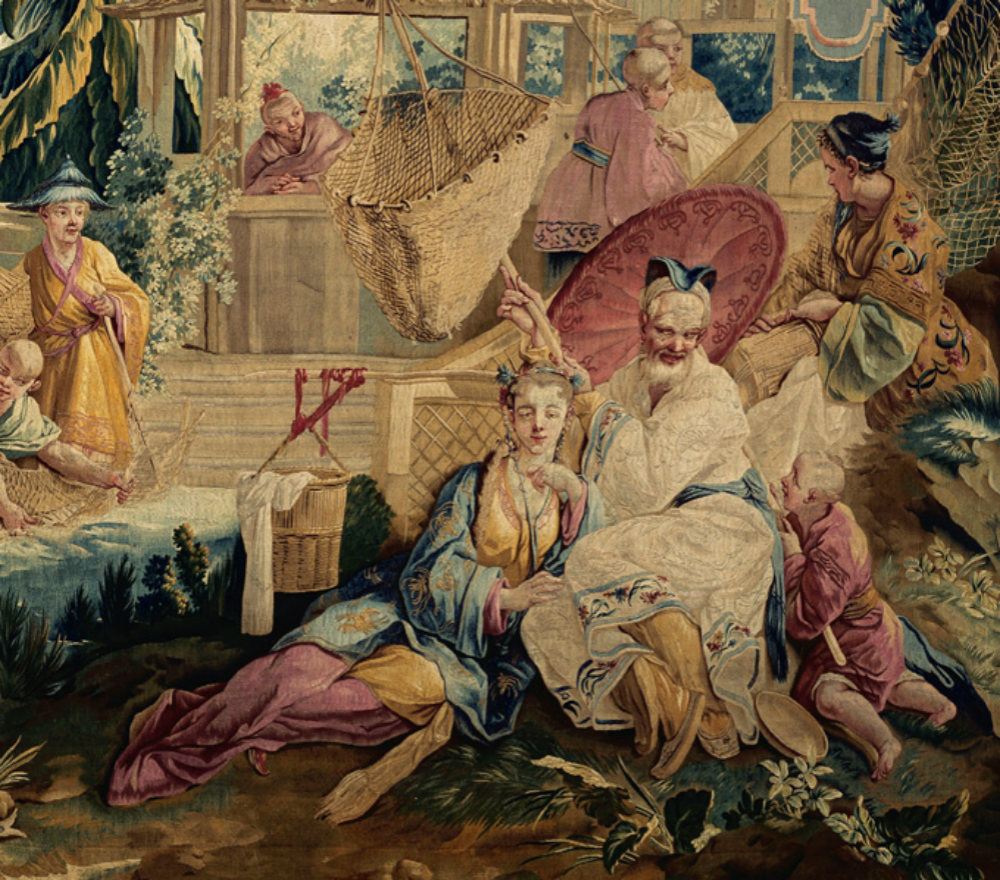 法语的“中国风”(chinoiserie)一词应运而生。既然供不应求,西方人就开始自己创造。无论在陶瓷、建筑、家居用品,抑或绘画、服装方面,都出现了中国元素,其中免不了“四不像”。例如18世纪的《中国皇帝》系列纺毯,画面结合了中国人物、热带植物,以及不中不西的怪异轿辇。直至19世纪西风东渐时代开启之时,西方人依然把握不好中国风格的精髓。尽管如此,他们的作品还是被当做艺术史中某一篇章珍藏于博物馆或艺术画廊——极受时装设计师偏爱的灵感迸发地。