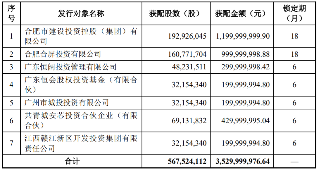 金总额35.3亿元,其中合肥市建设投资控股(集团)有限公司获配12亿元。