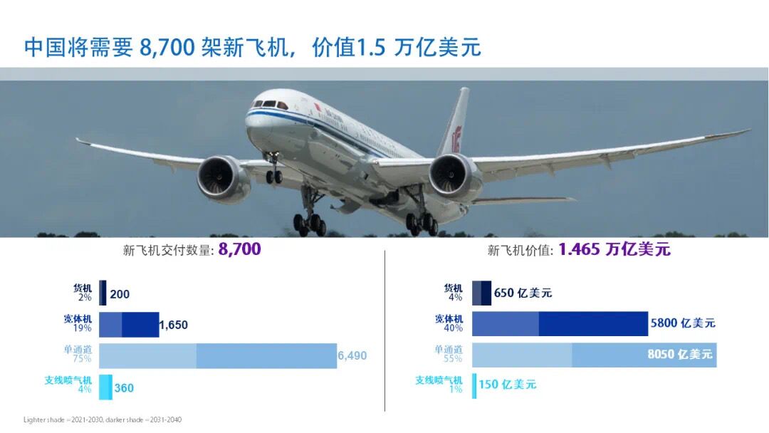 具体到中国市场,未来可能购买的8600架新飞机中,将有6450架是单通道飞机。